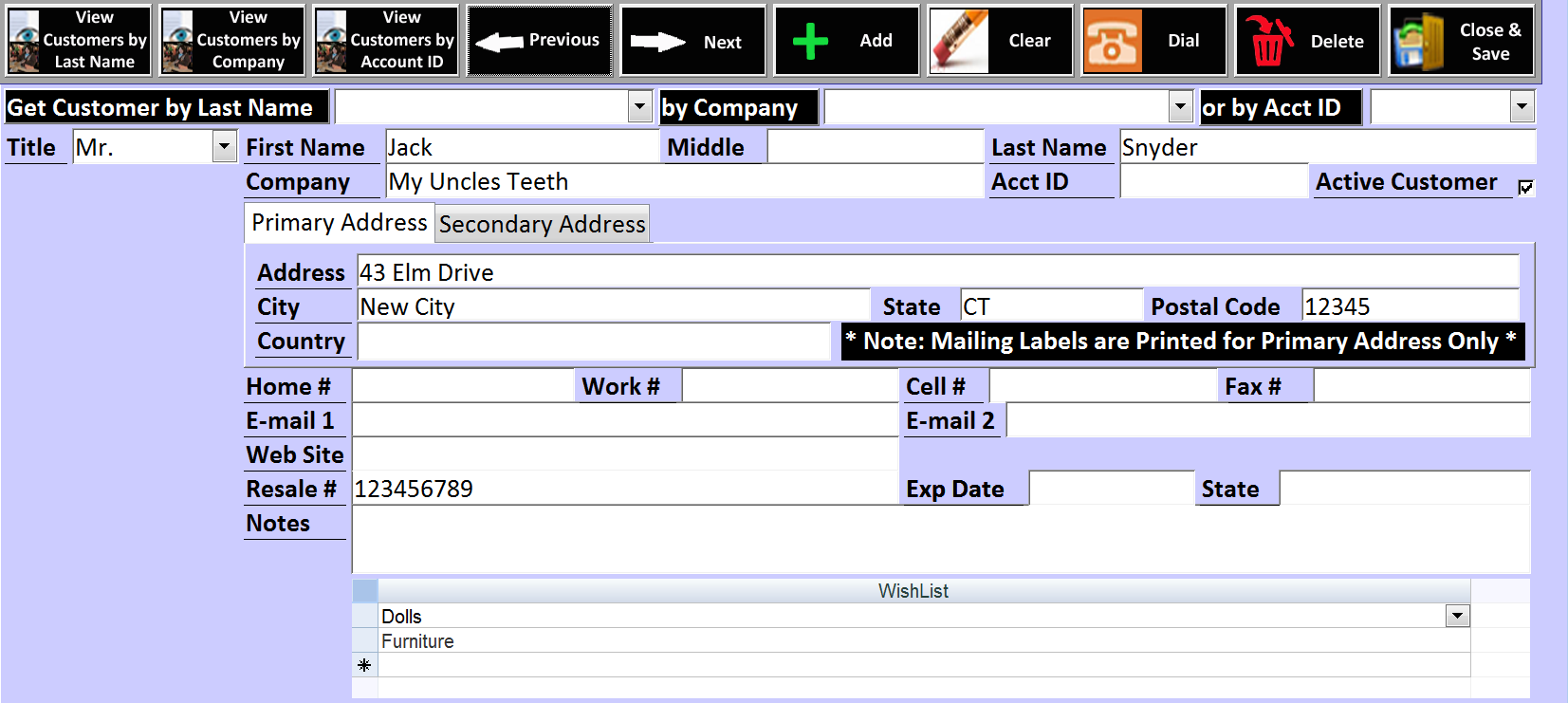 The Antique Mall Point of Sale (POS) Software allows you to Enter Your Customers on the fly on sales. You can even track your customer interests/wish list and produce reports on their interests and wish list. You are also able to produce mailing labels on your customers in a variety of sorts including by their interst/wish list, email them or if you have a voice modem dial them directly from the software.