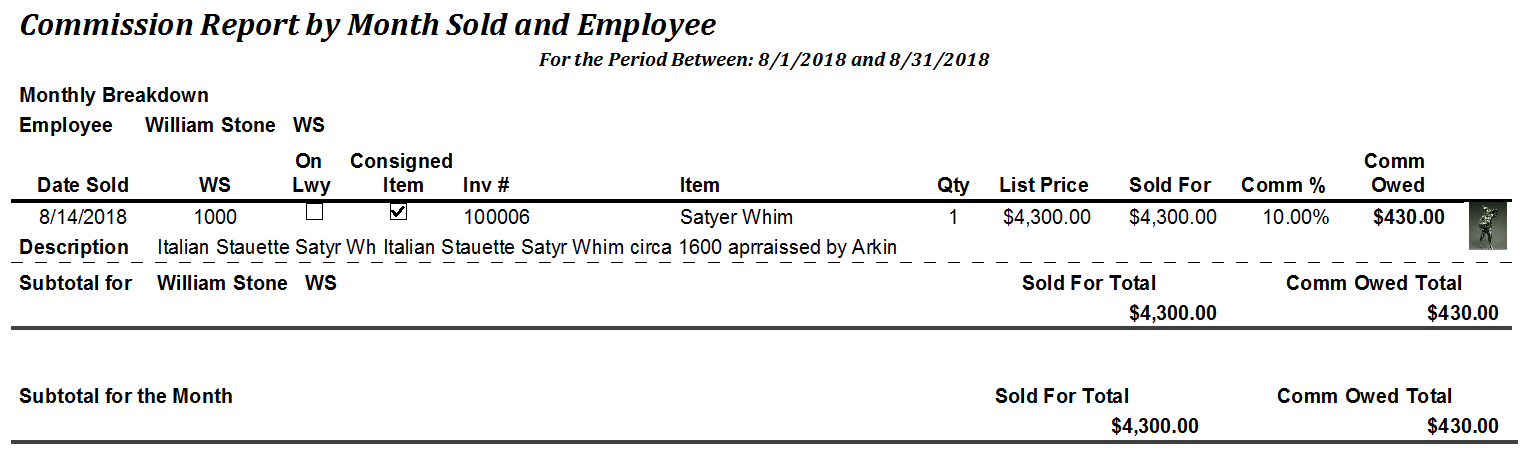 The Art Dealers FastTrack Inventory and Business Management Software Harmony TM has built in commission reports for Employees, Consigners, Artists and More.