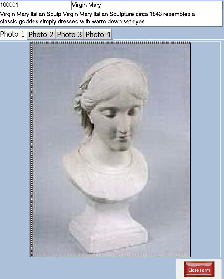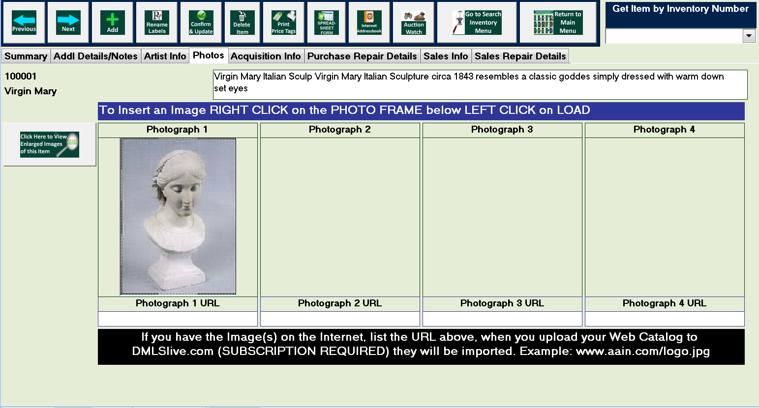 The Art Dealers FastTrack Inventory and Business Management Software Harmony TM the Inventory Data Entry Form allows you to include up to four photos for each item.