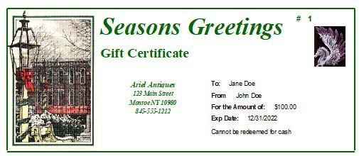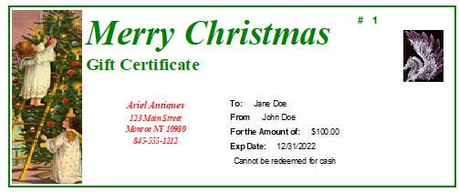 From within the Software you can Create Gift Certificate for Nine Different Types of Occassions with over 40 types of Certificates you can print. Gift Certificates also print a receipt for the Customer and for the Store.