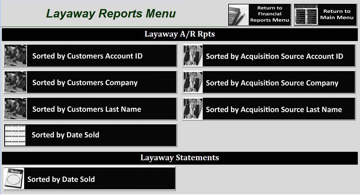 Within the Software you can run and track layaway receivables and run invoices to send to your customers to remind them payments is due.