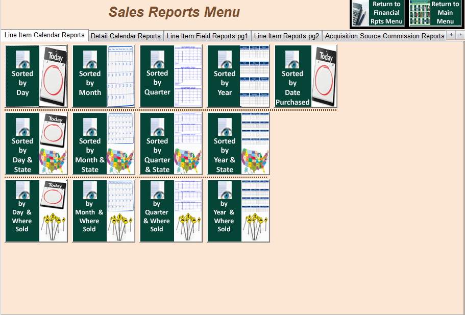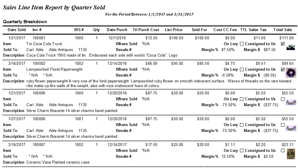 Sales Reports can be done by Date such as day, month quarter or year. You can also sort them by field such as inventory number, category, etc. You can also run commission reports on consignment items for your consigners. You can even run sales reports based on what customers in particular have purchased.