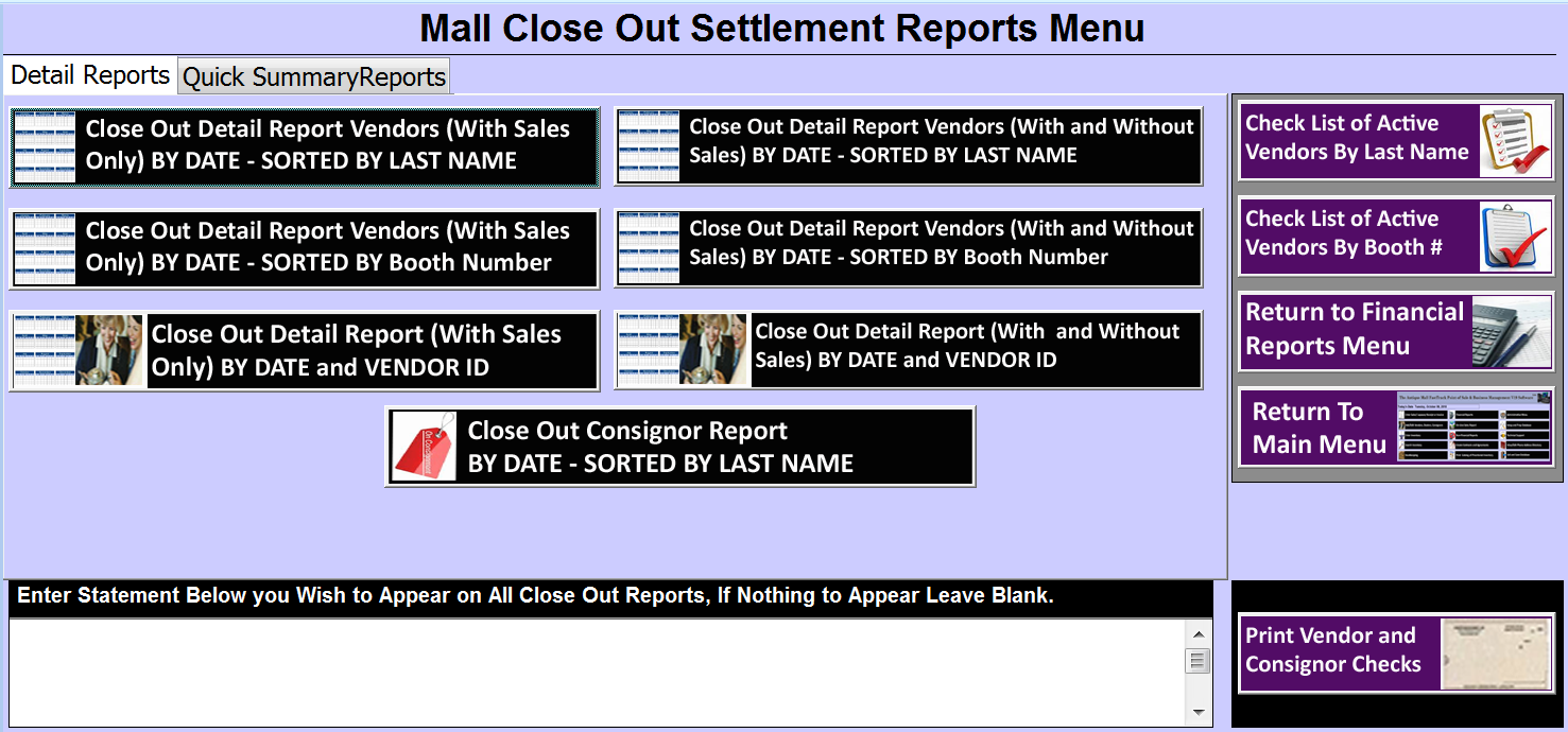 Over 700 built-in reports, detail reports, summary reports and quick reports. A partial list of reports include close out settlement reports, sales reports, layaway reports, vendor reports, tax reports, bookkeeping reports, inventory reports, expense reports, consignment reports, floor plans, rental reports, contracts, PLUS YOU CAN POST SALES REPORTS FOR YOUR VENDORS AND CONSIGNORS ON-LINE AS WELL AS CONSIGNMENT INVENTORY FOR SALE WITH A FREE SHOPPING CART and so much more. Print Close Out Checks for Vendors and Consignors |