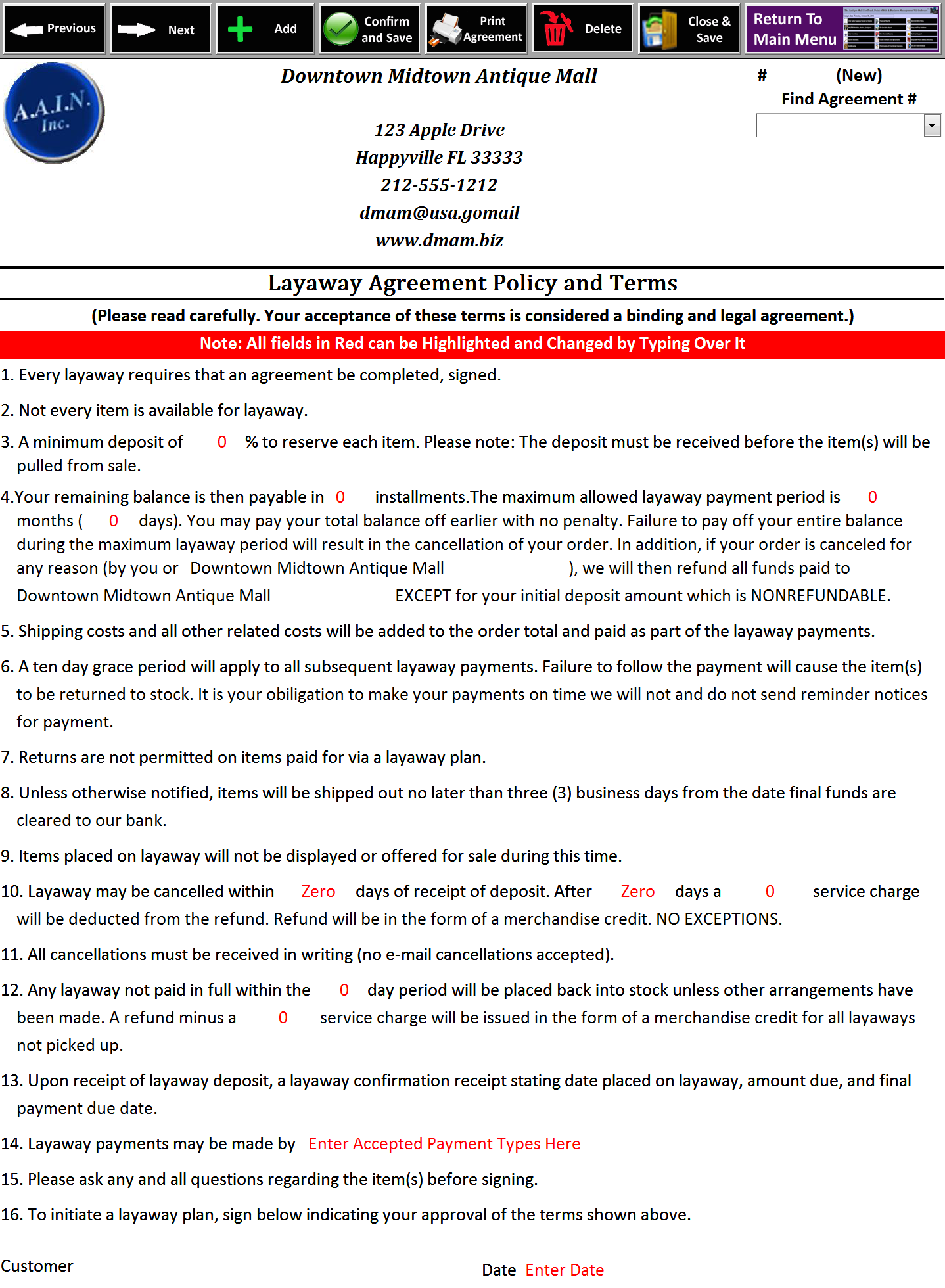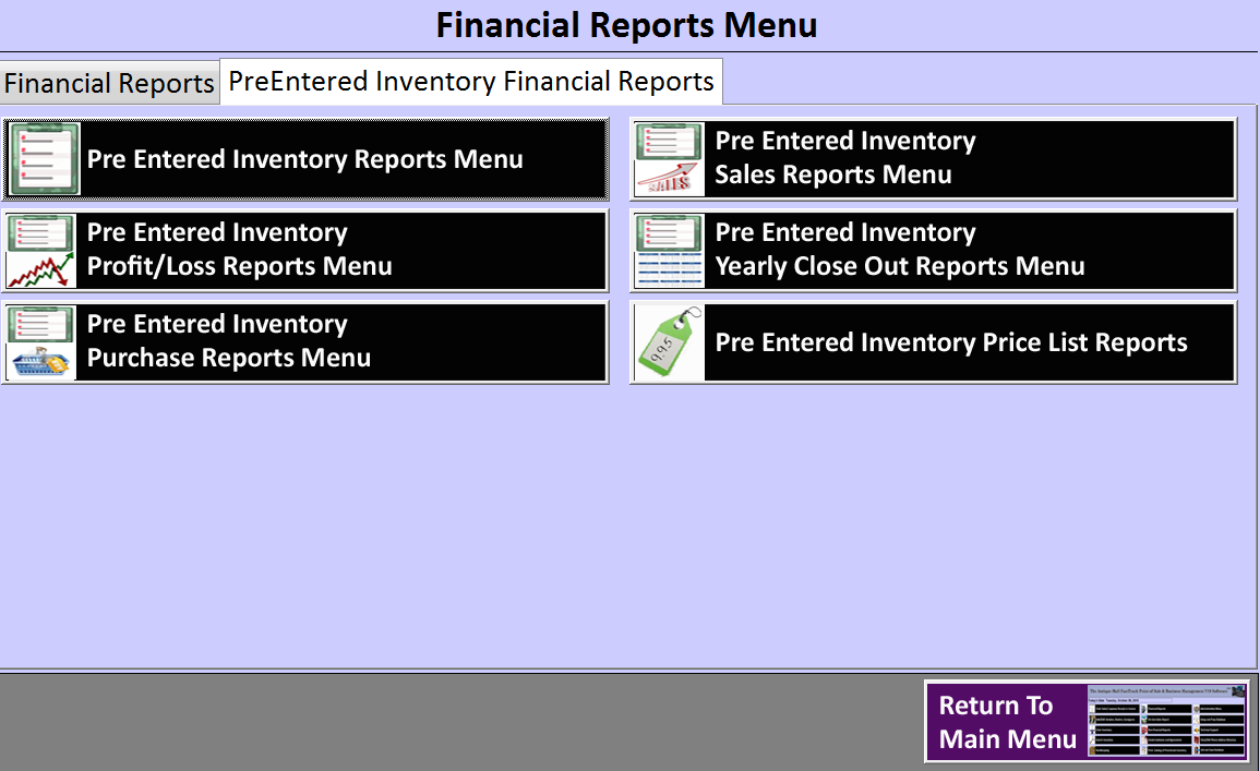 Reports, Memos, Agreements, Labels all built-in that help you manage your business efficiently and effectively. Automatically generate: Sales Reports; Bookkeeping Reports; Point of Sale (POS) Receipts and Invoices; Customer Reports; Mall Reports; Vendor Reports; Financial Reports; Layaway Reports; Floor Plans; Directories; Contracts; Gift Certificates; Consignment Reports; Customer Wish Lists; Consignment and Commission Agreements; Sales Tax Reports; Inventory Sales, Purchase and Profit/Loss Reports; Create Price Tags with images; Mailing Labels; On-Line Sales Reports; Plus Many others as well.