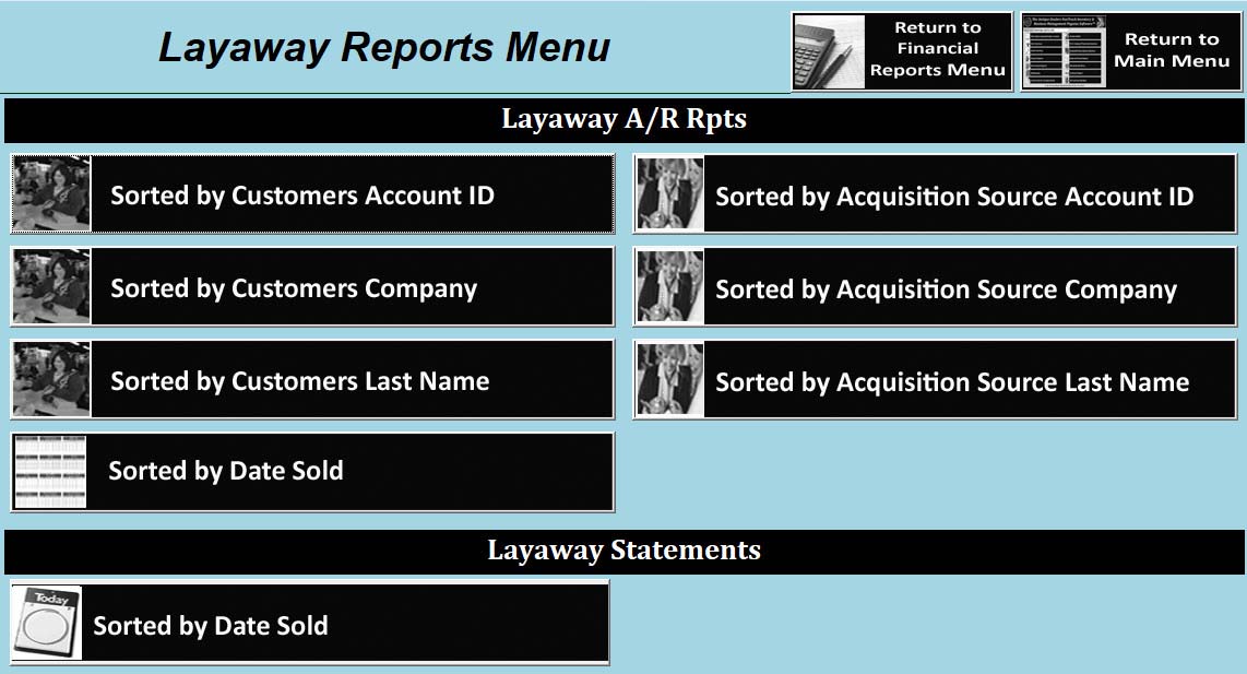 Within the Software you can run and track layaway receivables and run invoices to send to your customers to remind them payments is due