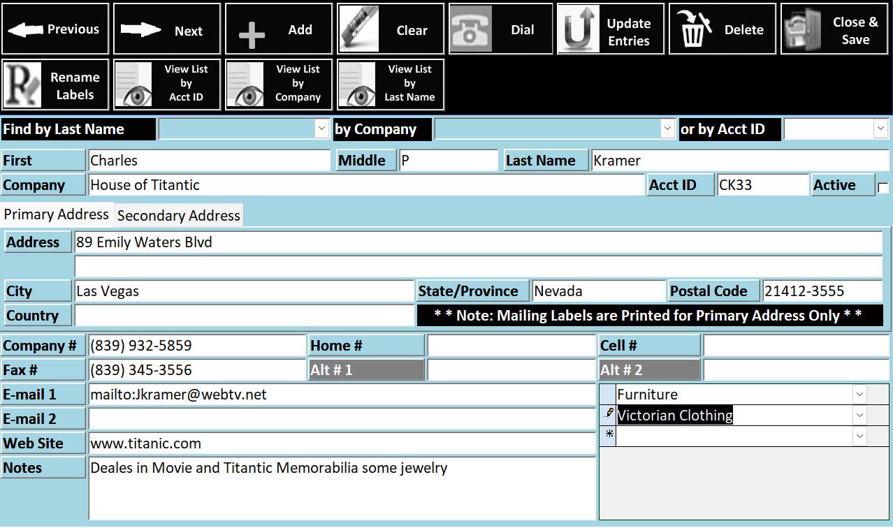 The Acquisiton Source/Suppliers Data Entry form helps you maintain accuracy about the person you acquired the item from. You can also print labels, dial and email them directly from the software. You can also maintain information on types of items they carry and run reports specifically to contact them should you need to acquire a similiar item for a customer to purchase.