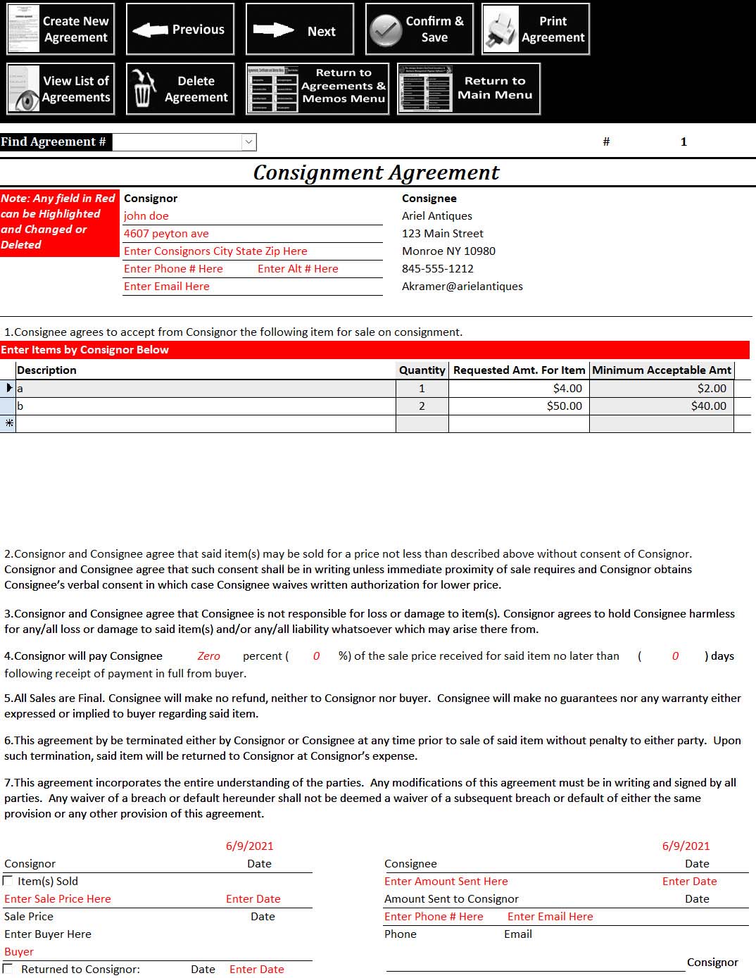 You can create, print and maintain Consignment Agreements with Acquisiton Sources for sale by you the Dealer.