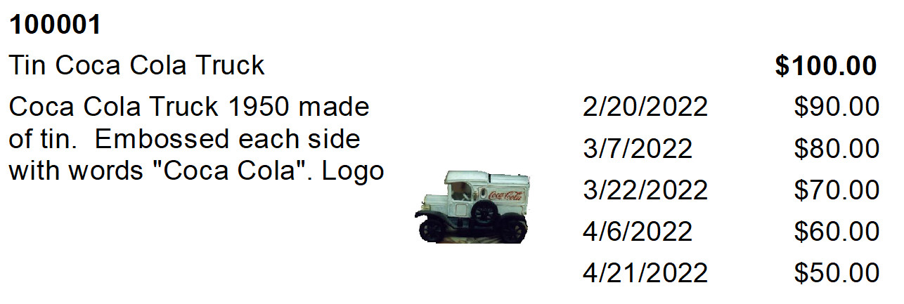 This form allows you to prep your software based on Date you Receive an item for discounts on Consignemnt Items to print on your price tags (samples below). Most sizes will print with thumb nail images.