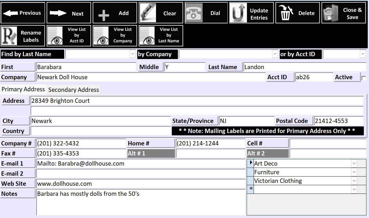 The Acquisiton Source/Suppliers Data Entry form helps you maintain accuracy about the person you acquired the item from. You can also print labels, dial and email them directly from the software. You can also maintain information on types of items they carry and run reports specifically to contact them should you need to acquire a similiar item for a customer to purchase.