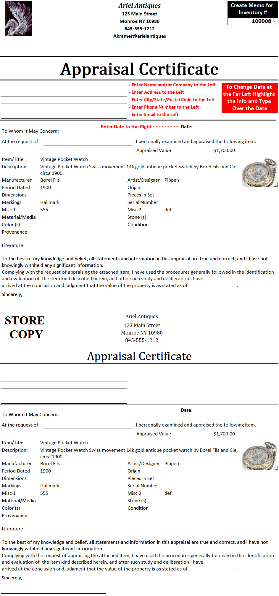 Create and Print Appraisal Certificates quickly for your customers on purchases they have made
