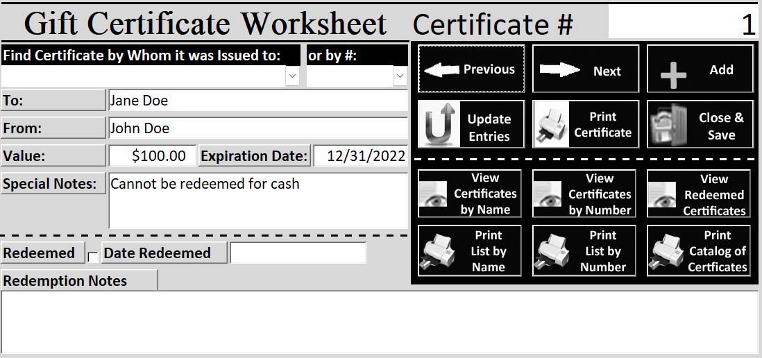 From within the Software you can Create Gift Certificate for Nine Different Types of Occassions with over 40 types of Certificates you can print. Gift Certificates also print a receipt for the Customer and for the Store.
