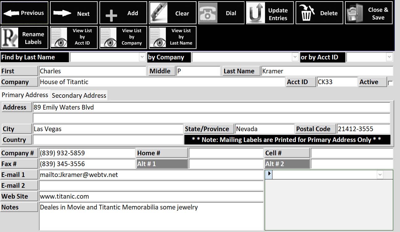 The Acquisiton Source/Suppliers Data Entry form helps you maintain accuracy about the person you acquired the item from. You can also print labels, dial and email them directly from the software. You can also maintain information on types of items they carry and run reports specifically to contact them should you need to acquire a similiar item for a customer to purchase.
